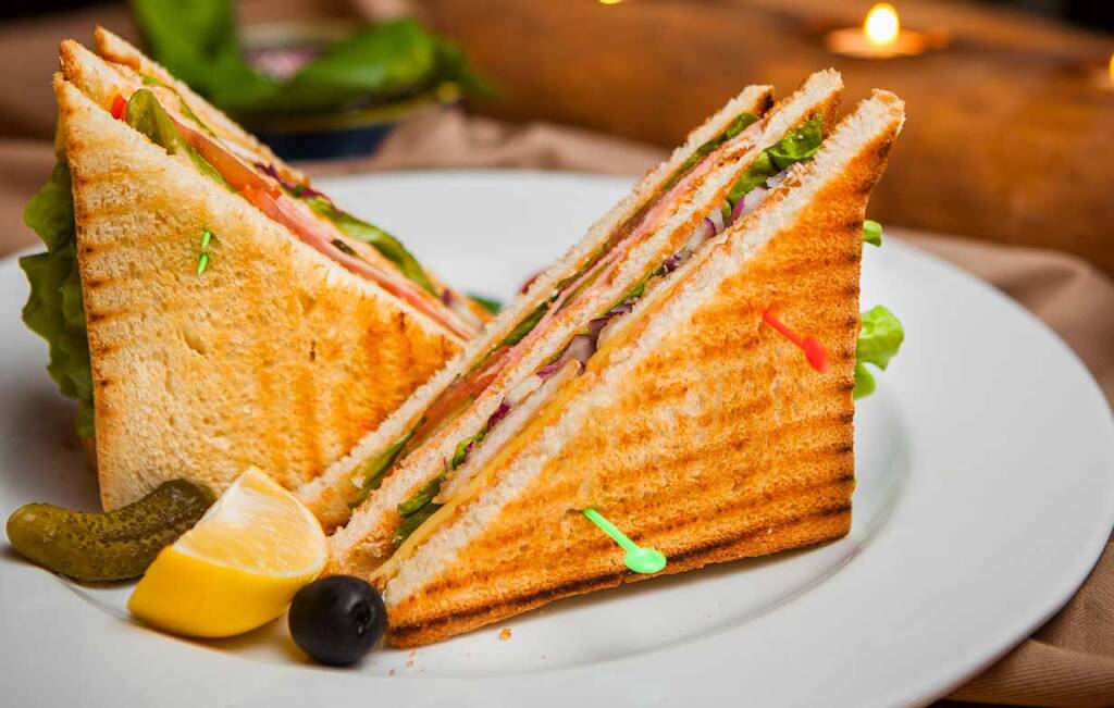 Side view club sandwich with salted cucumbers and lemon and olives in round white plate on wooden And it shows. Here’s what customers are saying about CRISP: